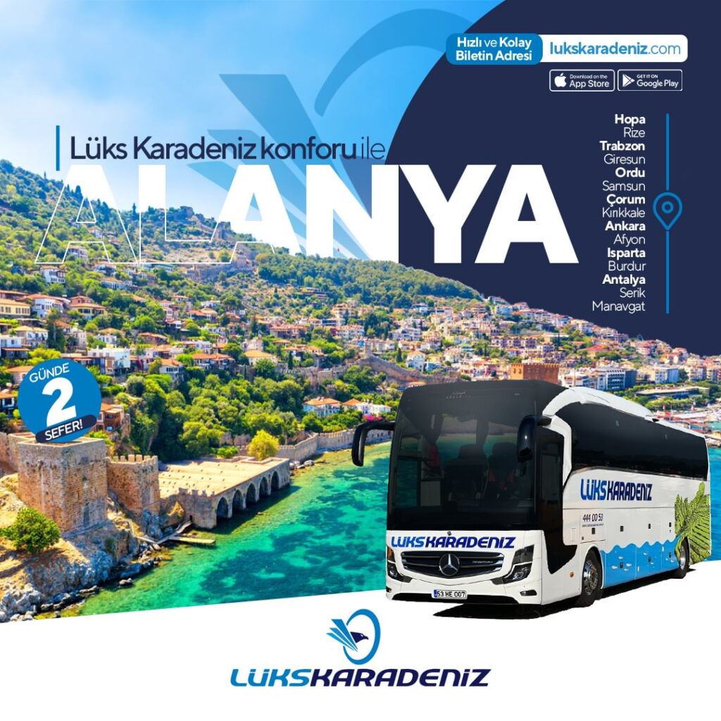LÜKS KARADENİZ ile başlangıç noktası Manavgat Otogar olmak üzere.. SERİK – ANTALYA – BURDUR – ISPARTA – AFYON – ANKARA – KIRIKKALE – ÇORUM – HAVZA – SAMSUN – TEKKEKÖY – ÇARŞAMBA – TERME – ÜNYE – FATSA – ORDU – BULANCAK – GİRESUN – ESPİYE – GÖRELE – BEŞİKDÜZÜ – VAKFIKEBİR – TRABZON – ARAKLI – SÜRMENE – OF – RİZE – GÜNDOĞDU – ÇAYELİ – PAZAR – ARDEŞEN – FINDIKLI – ARVAHİ – HOPA – KEMALPAŞA – SARP – BATUM – SAMTREDİA – KUTAİSİ – ZESTAFONİ – HAŞURİ – GORİ – TİFLİS için ulaşım sağlayabilirsiniz.