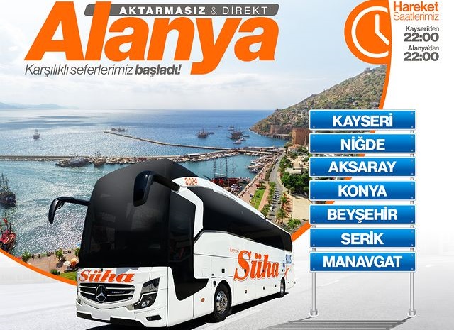 Süha Turizm ile başlangıç noktası Manavgat Otogar olmak üzere.. BEYŞEHİR – DEREBUCAK – KONYA – AKSARAY – BOR – NİĞDE – YEŞİLHİSAR – İNCESU – KAYSERİ güzergahlarına ulaşım sağlayabilirsiniz.